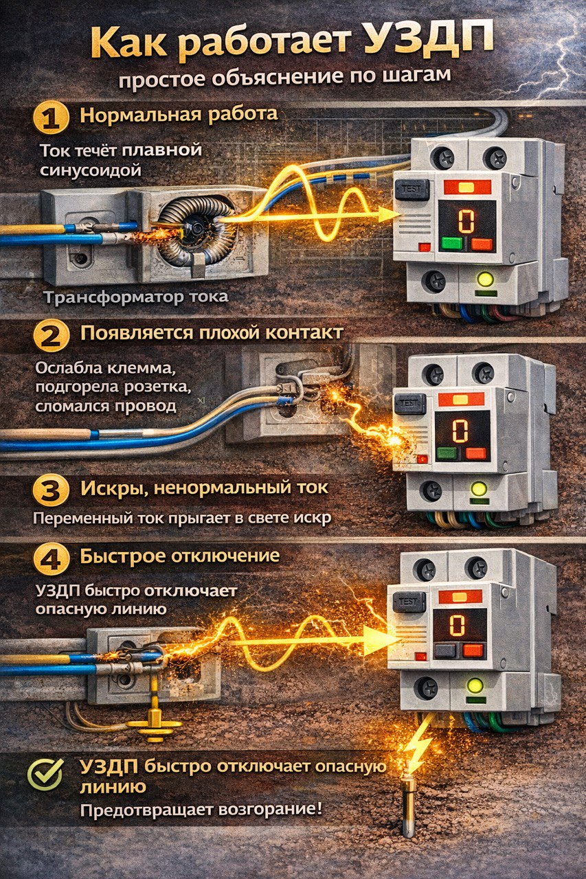 Практическая польза УЗДП — раннее обнаружение потенциально пожарного дефекта проводки и автоматическое отключение линии до возникновения возгорания. Это устройство существенно повышает пожарную безопасность электроустановки и дополняет, а не заменяет другие виды электрической защиты.