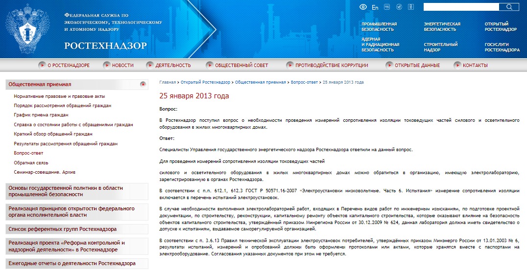 В Федеральную службу по экологическому, технологическому и атомному надзору (Ростехнадзор) поступил официальный запрос о порядке проведения измерений сопротивления изоляции токоведущих частей силового и осветительного оборудования в жилых многоквартирных домах.