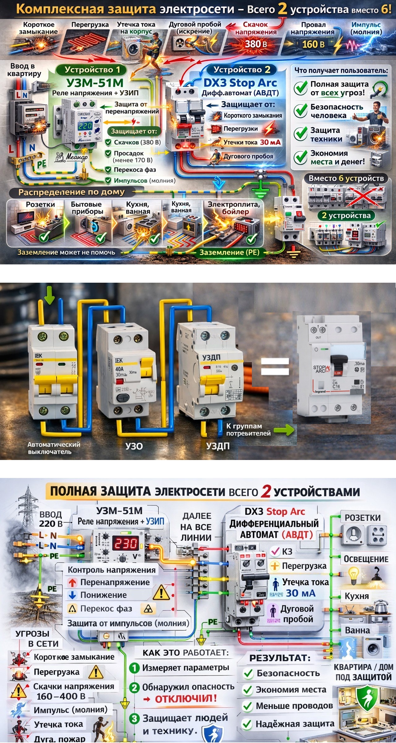 Пример: УЗМ-51М УХЛ4 российского производителя «Меандр», который совмещает функции защиты от перегрузки, скачков напряжения и импульсных перенапряжений. Такое устройство позволяет отслеживать электросетевые параметры и отключать линии при критических отклонениях, минимизируя риск повреждения техники и возгораний.