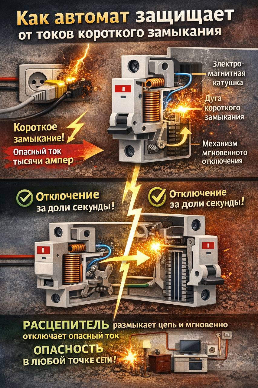 Итог: правильный выбор автомата — это не только номинал, но и подтверждённый ток КЗ, подходящая характеристика (B/C/D) и достаточная отключающая способность.