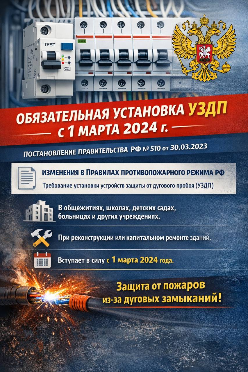 "Электроустановки зданий общежитий, хостелов, общеобразовательных организаций, образовательных организаций с наличием интерната, дошкольных образовательных организаций, специализированных домов престарелых и инвалидов (неквартирных), спальных корпусов организаций отдыха детей и их оздоровления, медицинских организаций, предназначенных для осуществления медицинской деятельности, оборудуются устройствами защиты от дугового пробоя, которые поддерживаются в исправном состоянии. Оборудование таких зданий, введенных в эксплуатацию до 1 марта 2024 г., указанными устройствами защиты осуществляется при их реконструкции или капитальном ремонте.