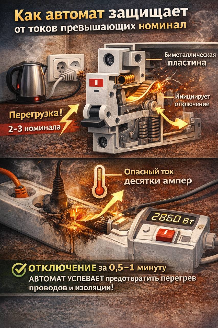 Современный автоматический выключатель обеспечивает двойную защиту: мгновенную — от короткого замыкания (электромагнитный расцепитель) и выдержанную по времени — от перегрузки (биметаллический расцепитель). Перегрузочная защита предотвращает перегрев и деградацию изоляции при превышении номинального тока, обычно срабатывая при токах порядка 2 In в течение 0,5–1 минуты. Корректность работы автомата проверяется испытательными приборами, а дополнительная диагностика (тепловизионный контроль и рефлектометрия) позволяет на ранней стадии выявлять перегрузки, дефекты изоляции и очаги искрения, повышая общую надёжность электроустановки.